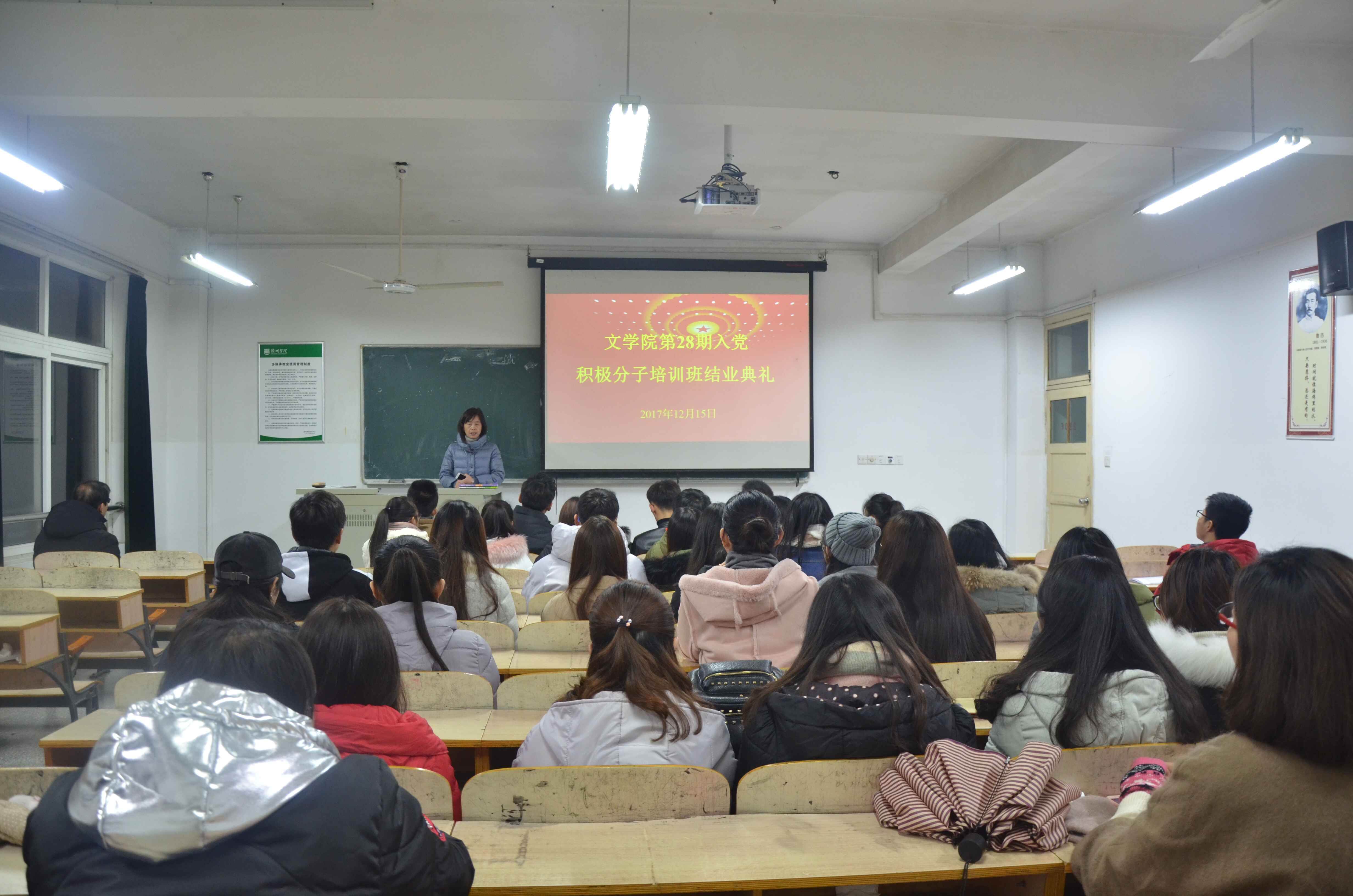 12月15日下午,文学与传媒学院第28期入党积极分子培训班结业典礼在文学楼举行,院党总支书记陆晓华、副书记周祥、培训班班主任夏群山及37名培训班学员参加了典礼。
