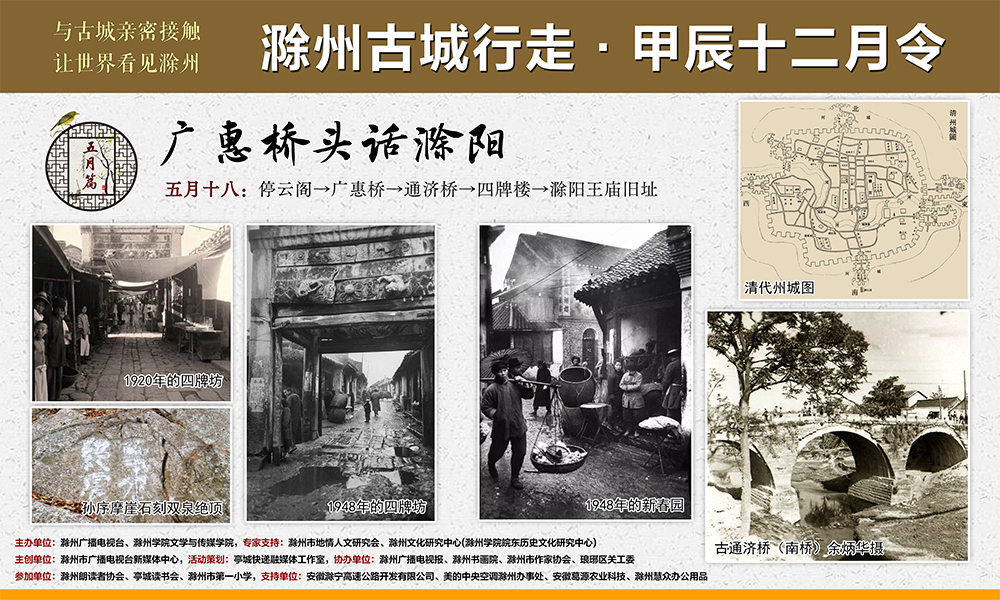 6月22日,农历五月十七,由滁州广播电视台、37000cm威尼斯文学与传媒学院主办的“滁州古城行走•甲辰十二月令”文化研学游公益活动之“五月篇:广惠桥头话滁阳”,于滁城停云阁启程。滁州市文史专家、琅琊区关工委副主任、区政协原副主席徐茵担任本期主讲嘉宾,沿着“停云阁—广惠桥—通济桥—四牌楼—滁阳王庙旧址”游学路线,为大家一路作导游讲解。