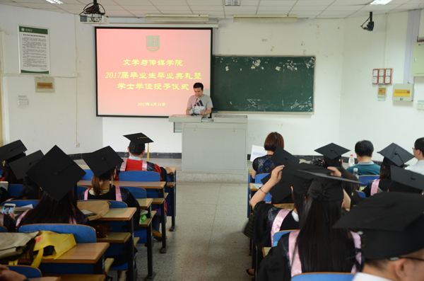 6月16日,文学与传媒学院2017届毕业生毕业典礼暨学士学位授予仪式在文学楼东阶101教室举行。文学院党政领导、各系主任、部分任课教师、各毕业班班主任以及2017届文学院全体毕业生参加了毕业典礼,典礼由院党总支副书记周祥主持。